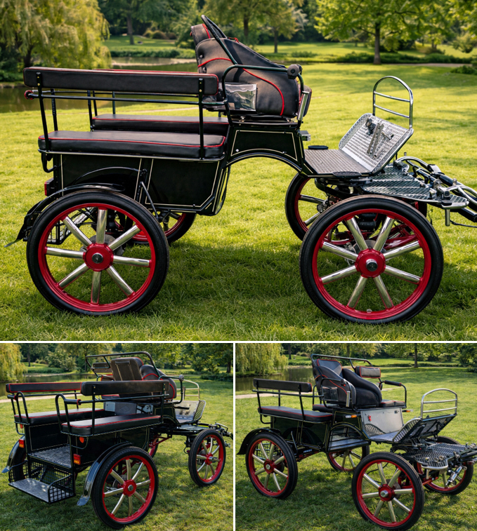 - Marathon New32: newly made Marathon for 1 and 2 horses, wheels 27″x27″, track width 148 cm, 4-wheel braking system, brake on the fifth wheel (turntable), stainless shafts, rear seat 100 cm, traffic electric lights.